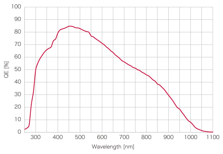 与大多数传统的科研相机相比,ORCA-Quest在280 nm-400 nm 紫外区域具有较高的量子效率(QE)。