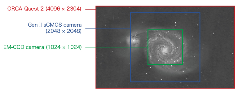 ORCA-Quest 2 realizes ultra-low noise with 9.4 megapixels (4096 (H) × 2304 (V)). ORCA-Quest 2 is capable of capturing a larger number of objects, compared to conventional scientific cameras like Gen Ⅱ sCMOS and EM-CCD camera.