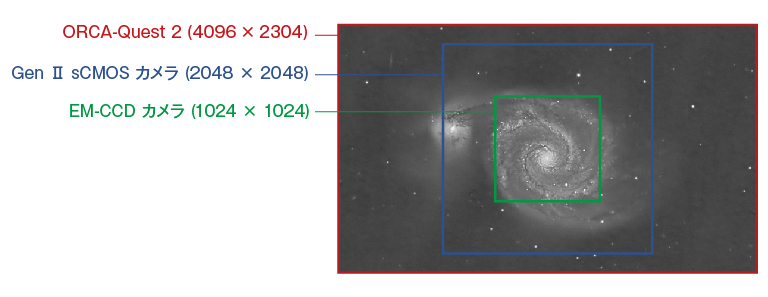 ORCA-Quest 2では、極低ノイズを実現しながらも、9.4メガピクセルの画素数(4096(H)× 2304(V))という高画素を実現することで、従来のGenⅡ sCMOSカメラ、EM-CCDカメラの画素数に比べて、一度により多くの対象物を撮像することが可能になりました。