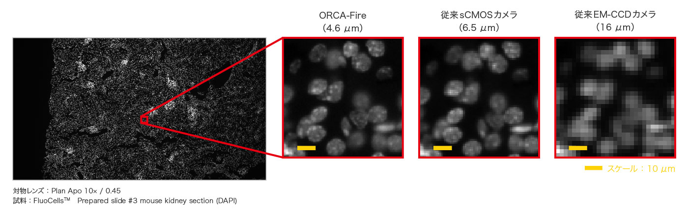 ORCA-Fireは低倍率と高分解能の両立を実現するため、従来のsCMOSカメラの画素サイズが6.5 μmであるのに対し、 4.6 μmという小さな画素サイズを持ったセンサを搭載しました。低倍率で高い分解能を必要とする用途に最適なカメラとなっています。